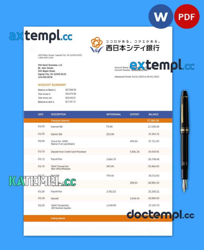 sample Nishi-Nippon City Bank enterprise account statement Word and PDF template download