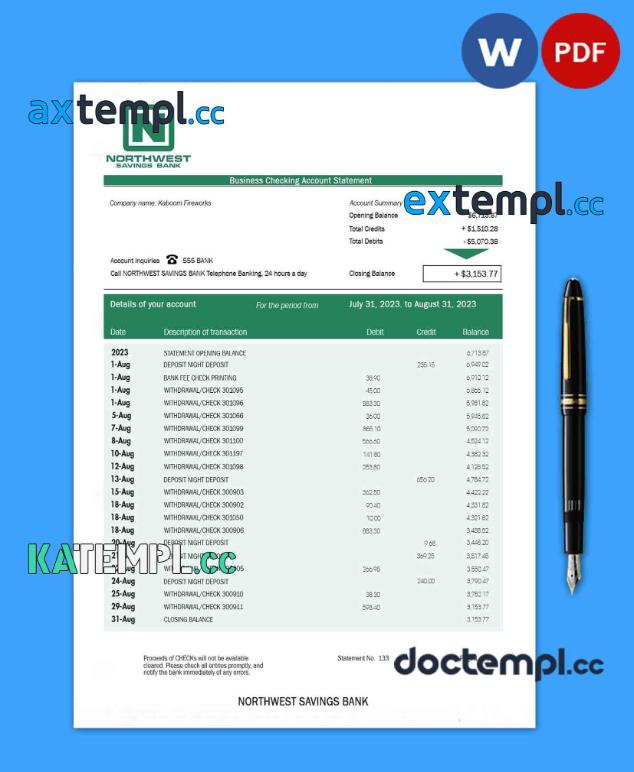 sample Northwest Savings Bank organization checking account statement Word and PDF template download