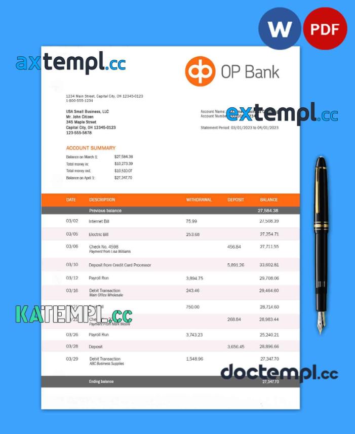 sample OP Bank company account statement Word and PDF template download