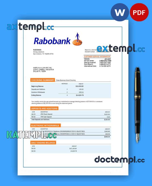 sample RABOBANK bank organization account statement Word and PDF template download