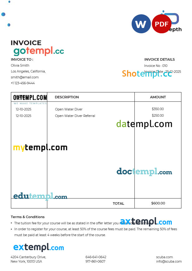 sample Scuba Diving School Invoice template in word and pdf format download