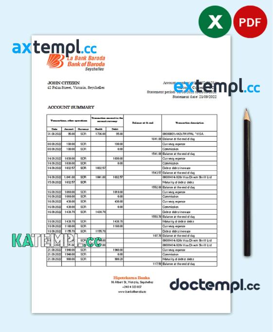 sample Seychelles Bank of Baroda bank statement, Excel and PDF template download