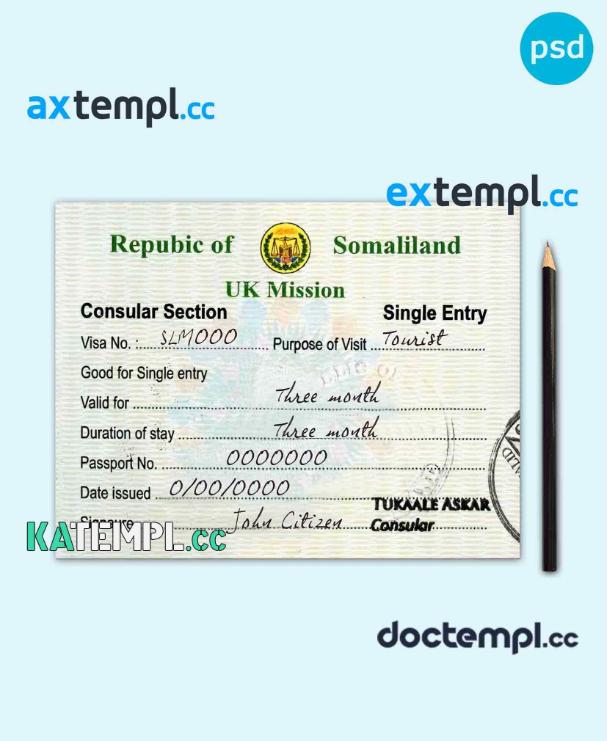 sample Somaliland travel visa PSD template, with fonts download