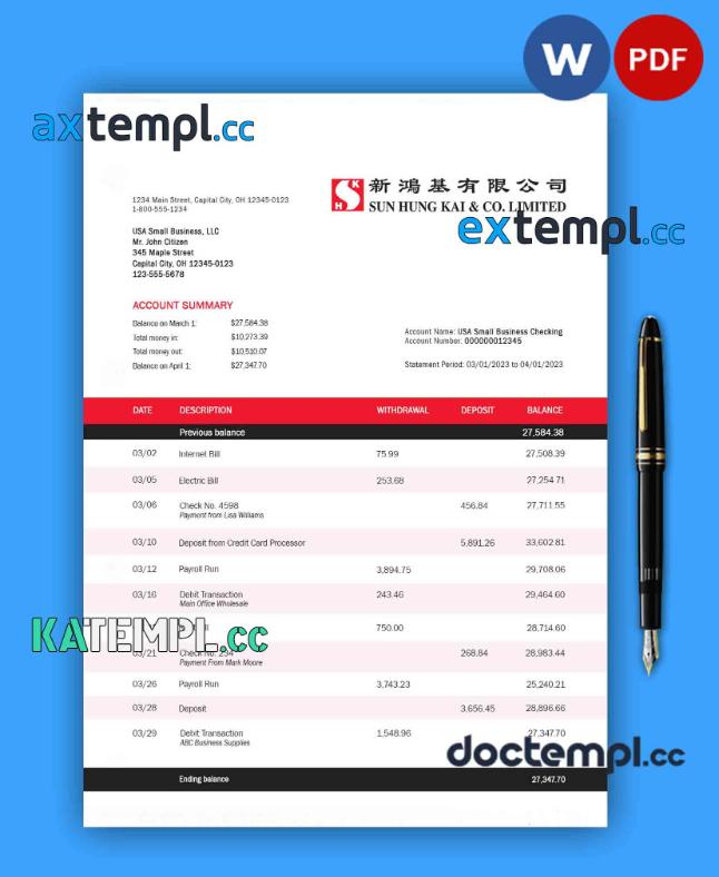 sample Sung Hung Kai Bank company account statement Word and PDF template download