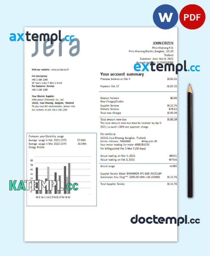 sample Thailand JERA power utility bill template in Word and PDF format download