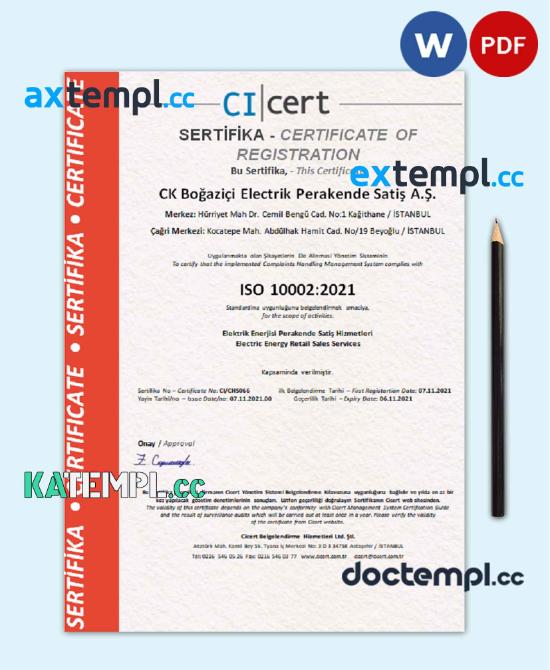sample Turkey Cicert certificate template in Word and PDF format, fully editable download