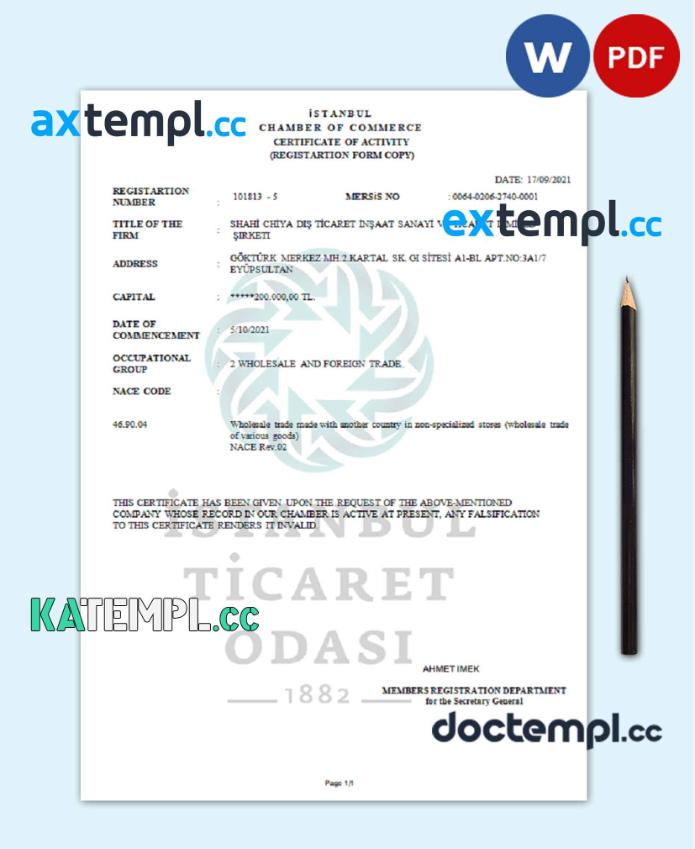 sample Turkey Istanbul Certificate of Activity template in Word and PDF format download