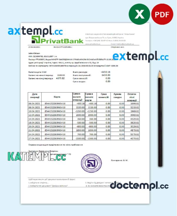 sample Ukraine PrivatBank bank statement easy to fill template in Excel and PDF format download