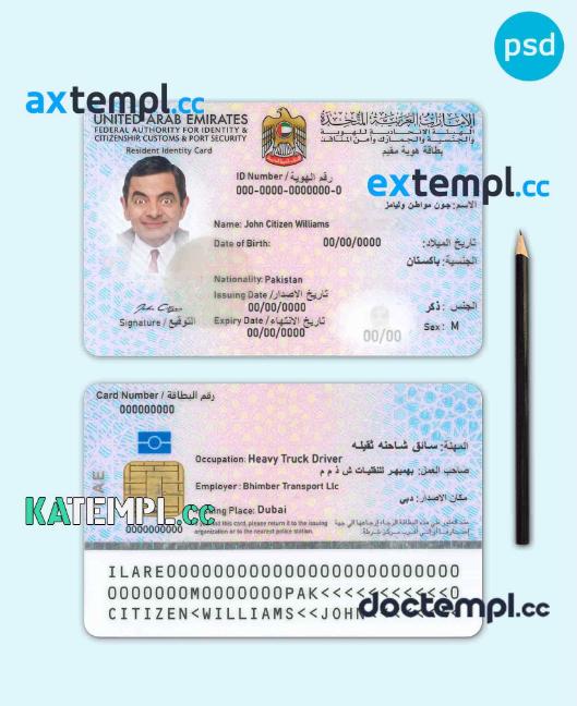 sample United Arab Emirates resident identity card (residency visa) PSD template download