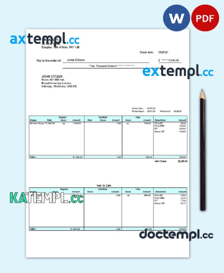 sample United Kingdom pay stub template in Word and PDF format, fully editable download