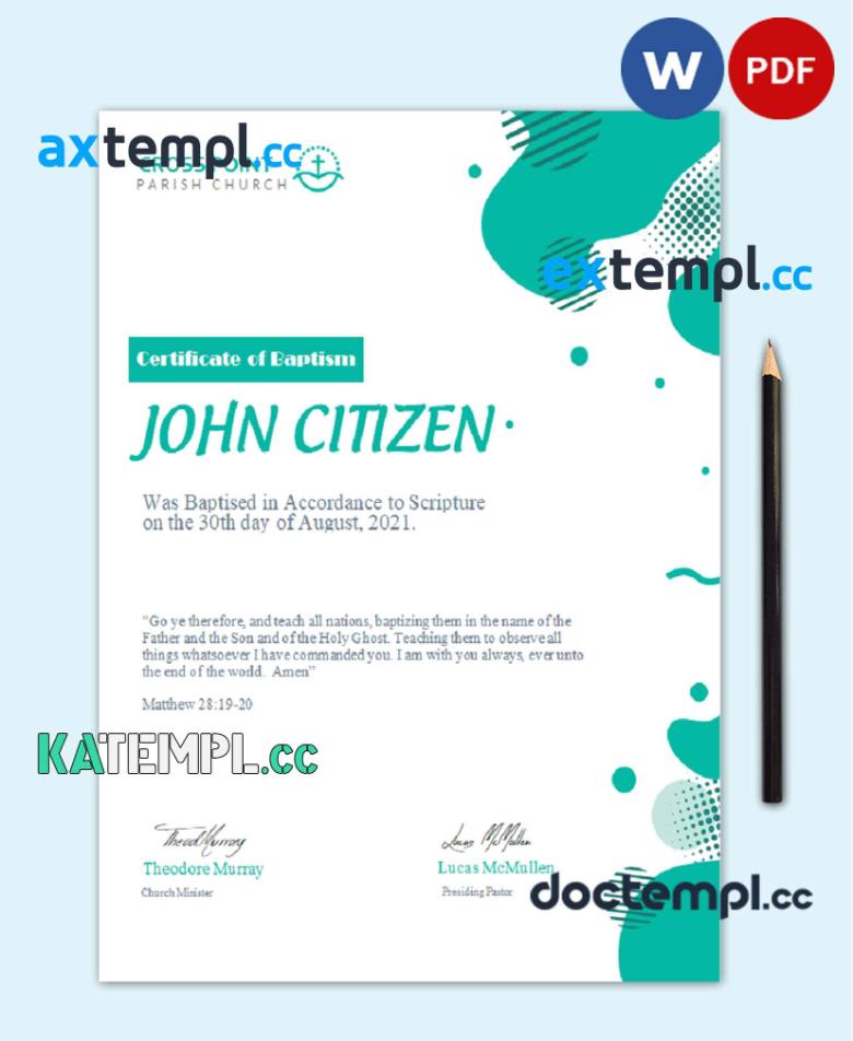 sample USA Baptism certificate template in Word and PDF format, version 2 download