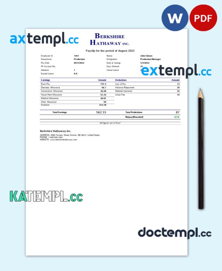 sample USA Berkshire Hathaway conglomerate company pay stub Word and PDF template download