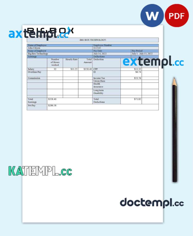sample USA Big Box Technologies technology company pay stub Word and PDF template download