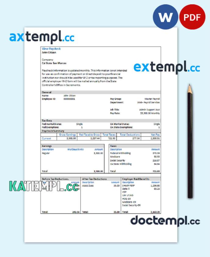 sample USA Cal State San Marcos payroll services company pay stub Word and PDF template download