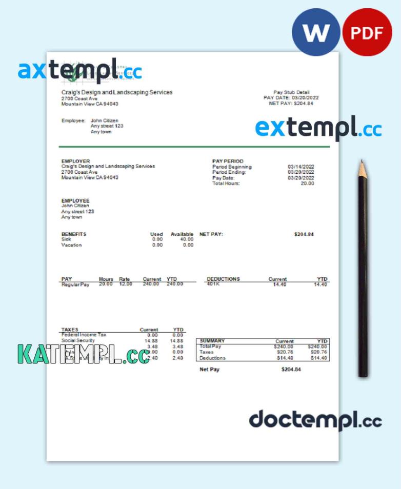 sample USA California design & landscaping services company pay stub template in Word and PDF format download