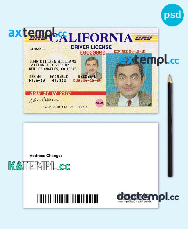 sample USA California driving license template in PSD format, version 3 download