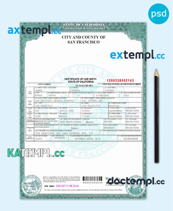 sample USA California state birth certificate template in PSD format, fully editable download