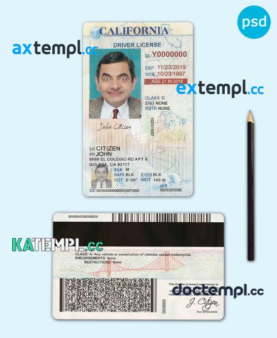 sample USA California state vertical driving license editable PSD template, under 21 download