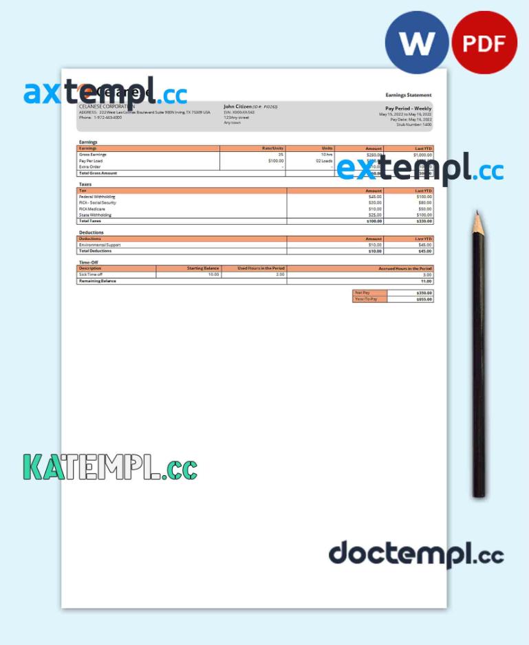 sample USA Celanese technology company pay stub Word and PDF template download