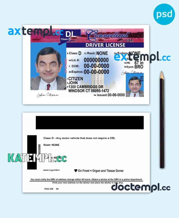 sample USA Connecticut driving license template in PSD format, version 2 download