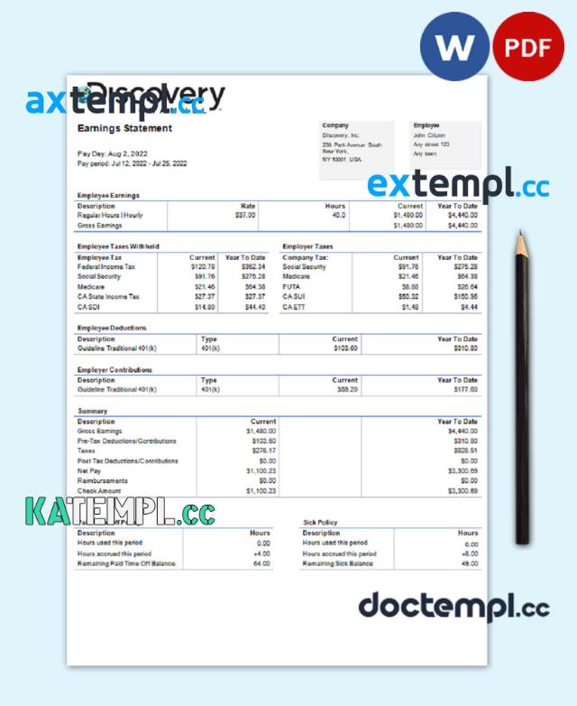 sample USA Discovery Inc. entertainment company pay stub Word and PDF template download