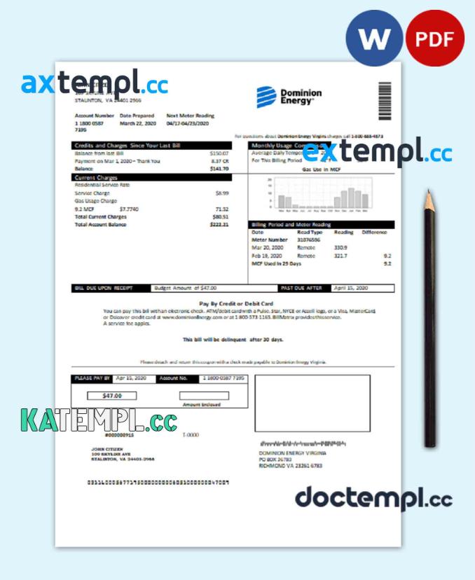 sample USA Dominion Energy utility bill template in Word and PDF format download