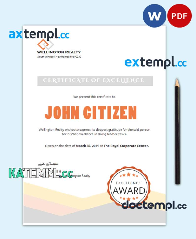 sample USA Excellence certificate template in Word and PDF format, version 2 download
