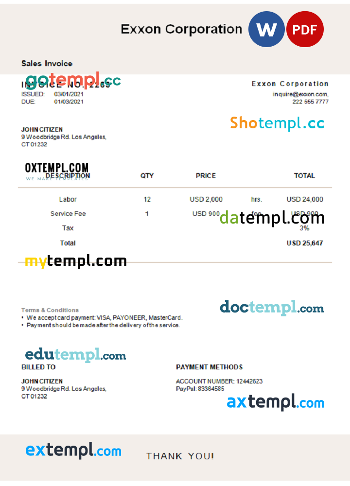 sample USA Exxon Corporation invoice template in Word and PDF format, fully editable download