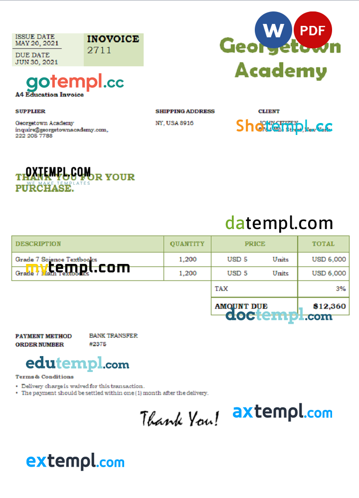 sample USA Georgetown Academy invoice template in Word and PDF format, fully editable download