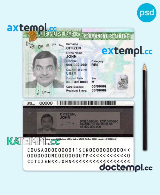 sample USA green card, permanent resident card template in PSD format, fully editable download