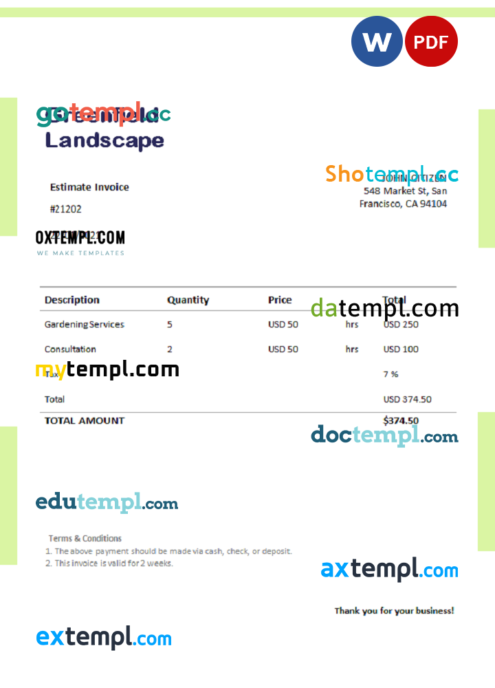 sample USA Greenfield Landscape invoice template in Word and PDF format, fully editable download