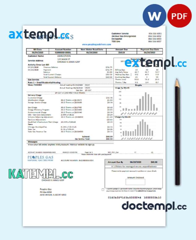 sample USA Illinois Peoples Gas utility bill template in Word and PDF format download