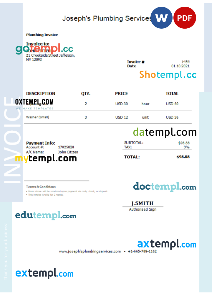 sample USA Joseph’s Plumbing Services invoice template in Word and PDF format, fully editable download