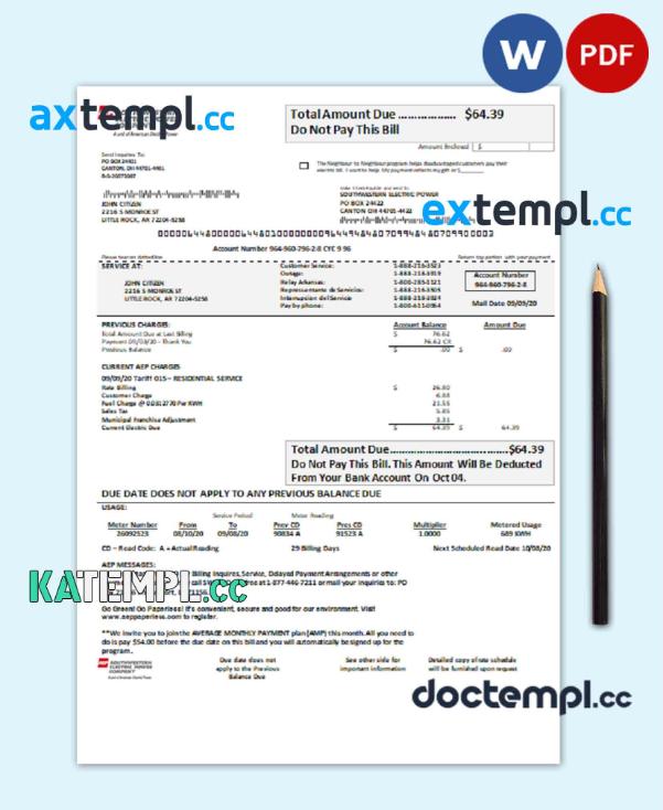 sample USA Louisiana AEP (Southwestern Electric Power Company) electricity utility bill template in Word and PDF format download