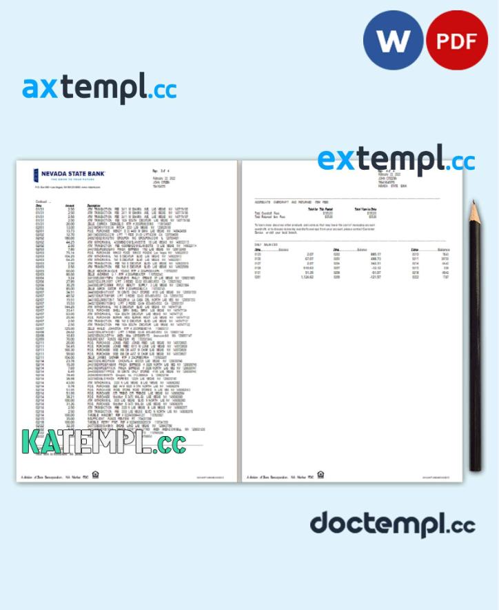 sample USA Nevada State Bank anytime checking statement, Word and PDF template, 4 pages download