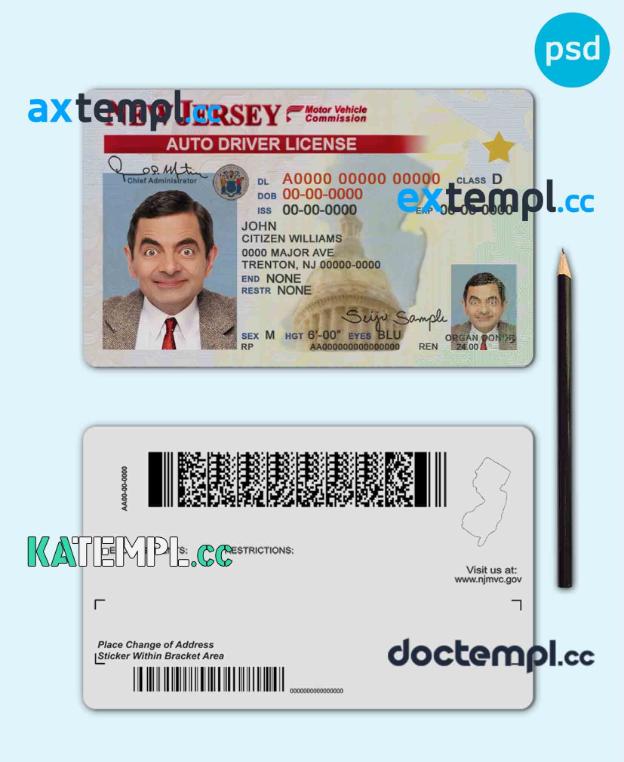 sample USA New Jersey driving license template in PSD format, with the fonts download