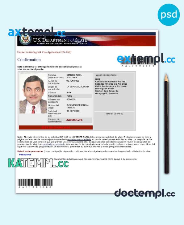 sample USA nonimmigrant visa application (DS-160) PSD template, with fonts download