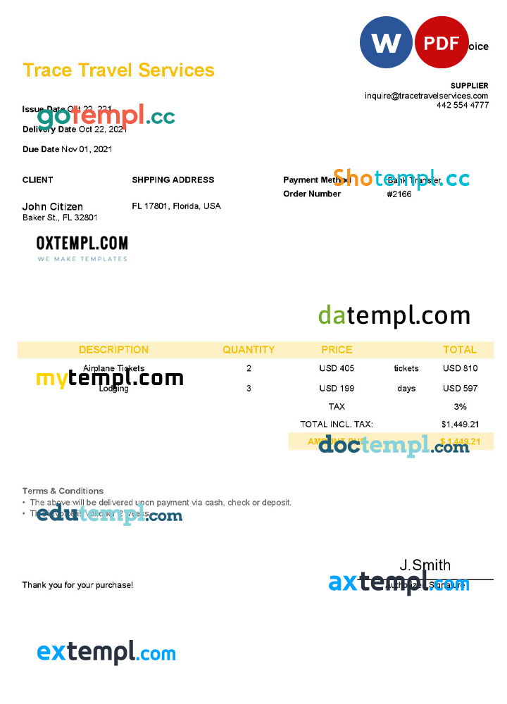 sample USA Trace Travel Services invoice template in Word and PDF format, fully editable download