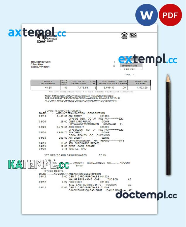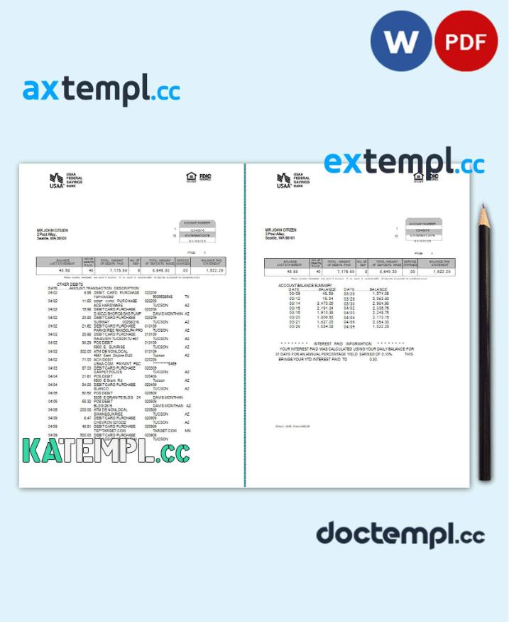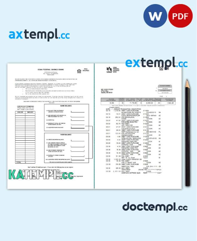 sample USA USAA bank statement Word and PDF template, 5 pages download
