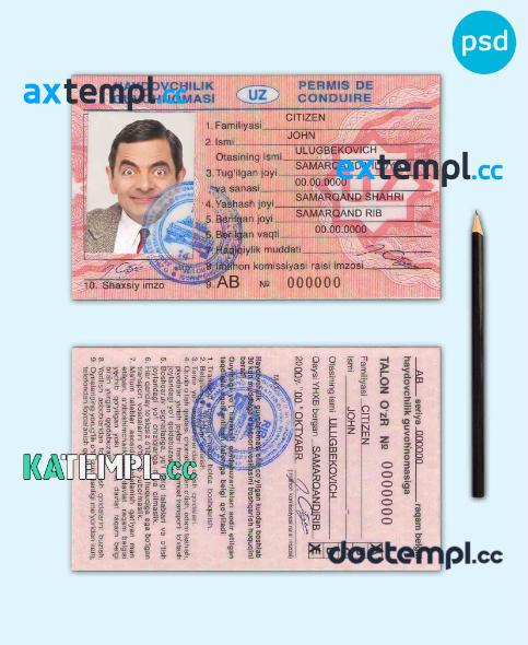 sample Uzbekistan driving license PSD template, completely editable download