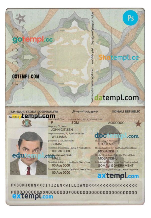 Somalia (Soomaaliya) passport template two in one with editable PSD photo look. This template is fully customizable and compatible with Adobe Photoshop.