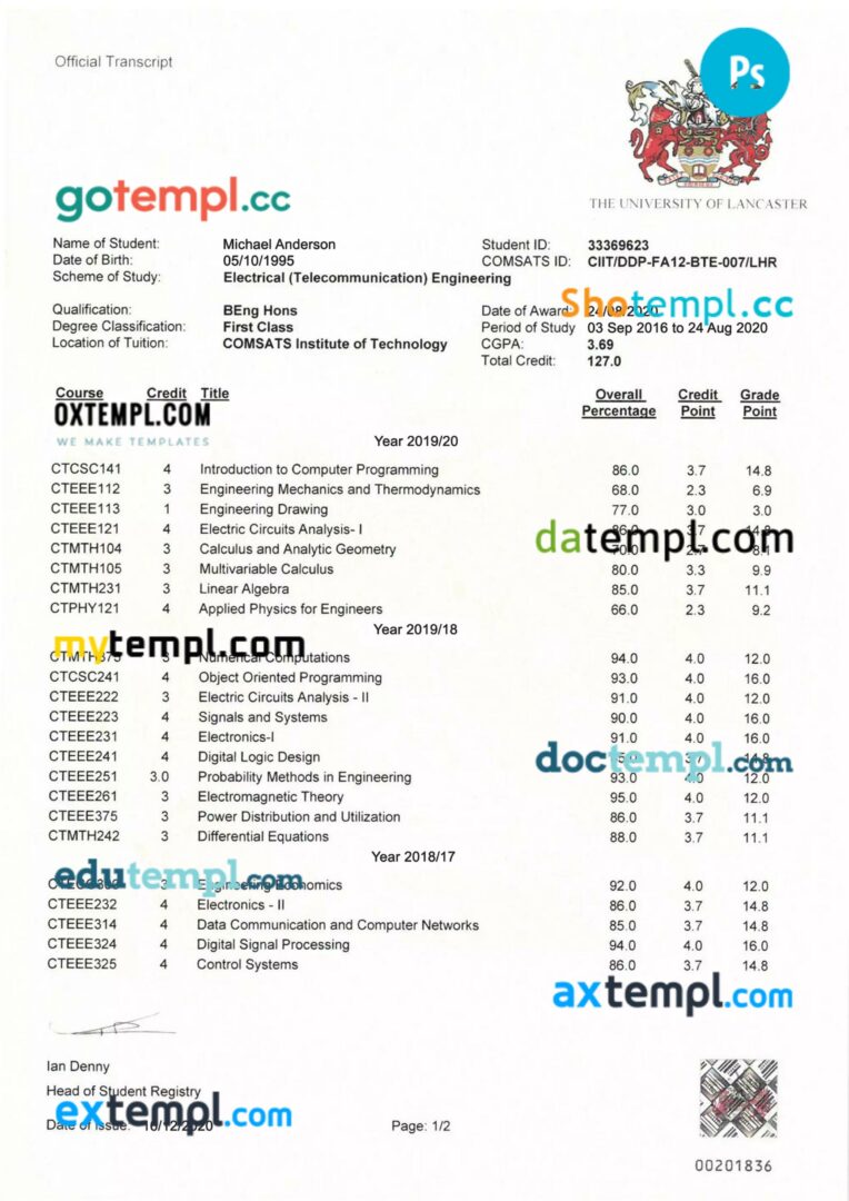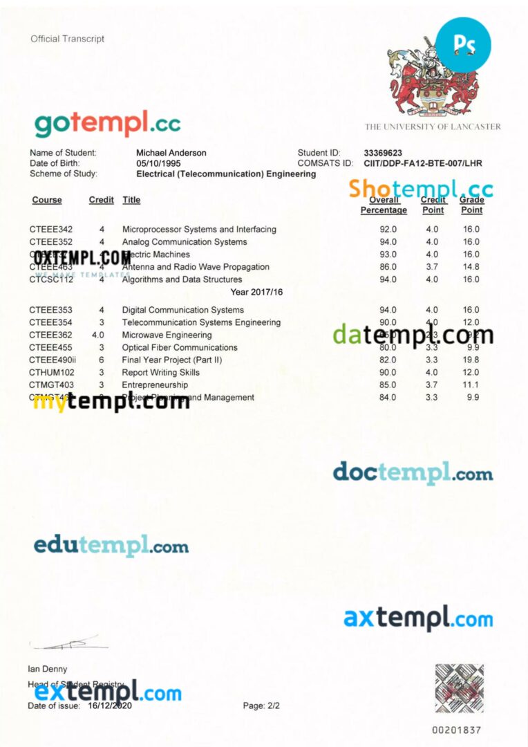 Fully editable sample of official academic transcript of records in PSD format – easy to fill.