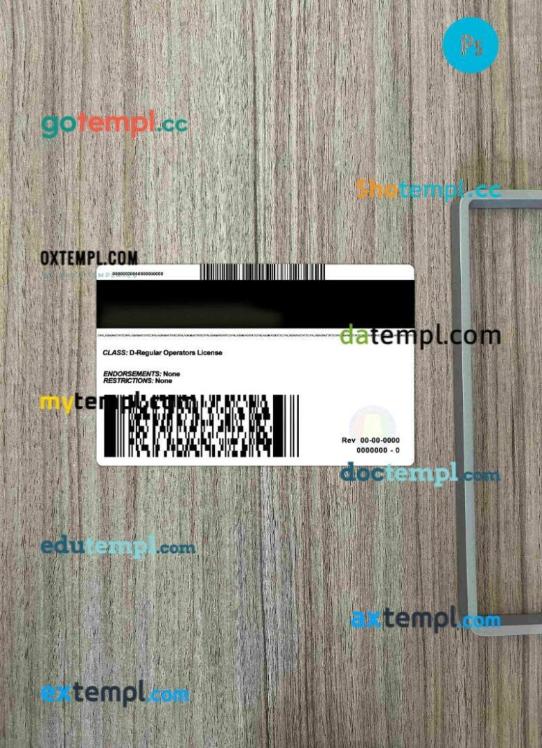 Our USA Alabama driver’s license template offers two options in one package: editable PSD files for both photo and scan looks.