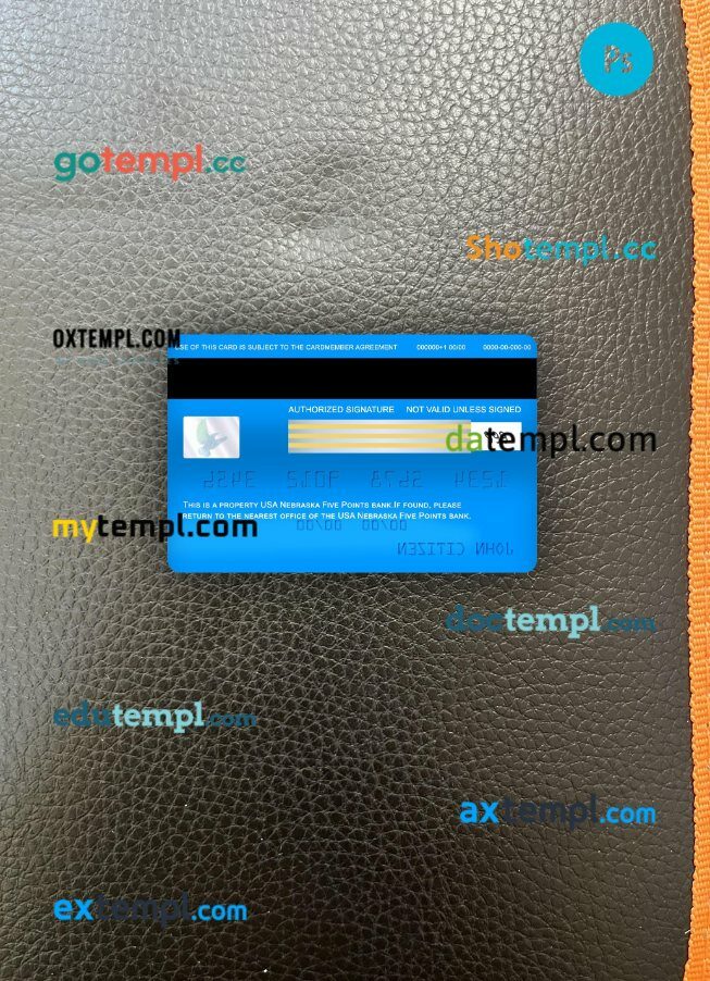 Our USA Nebraska Five Points Bank visa classic card PSD template provides a multi-functional solution with a clean design, providing both the front and back of the card for a realistic look.