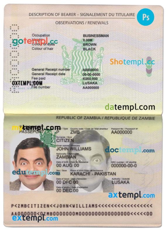 Zambia passport template two in one with editable PSD photo look. This template is fully customizable and compatible with Adobe Photoshop.